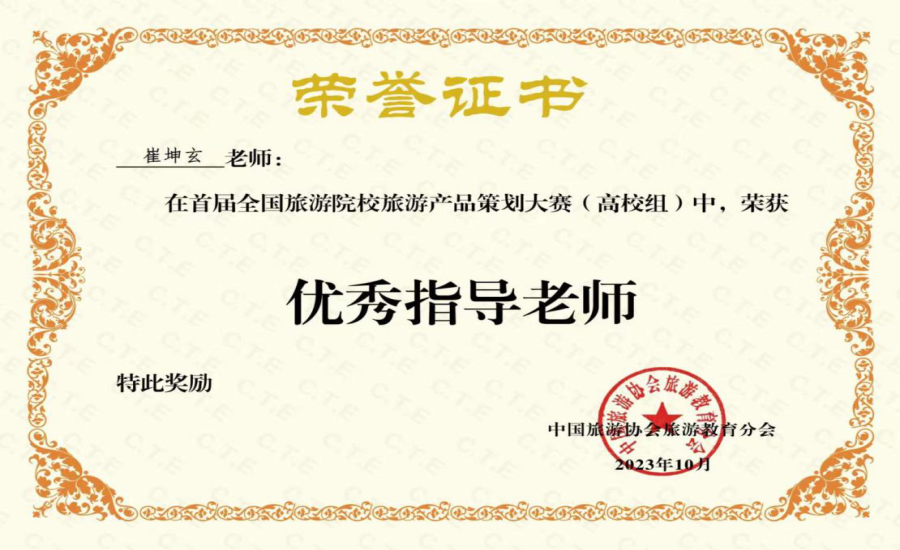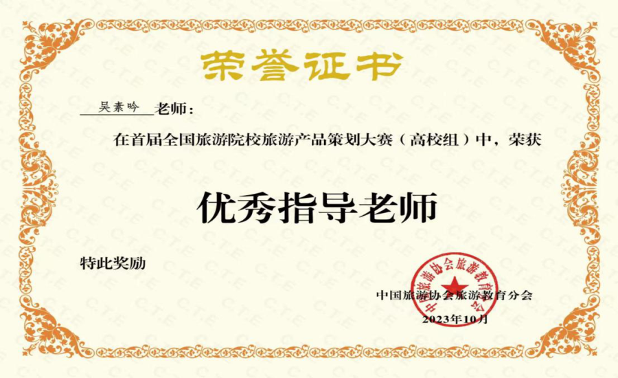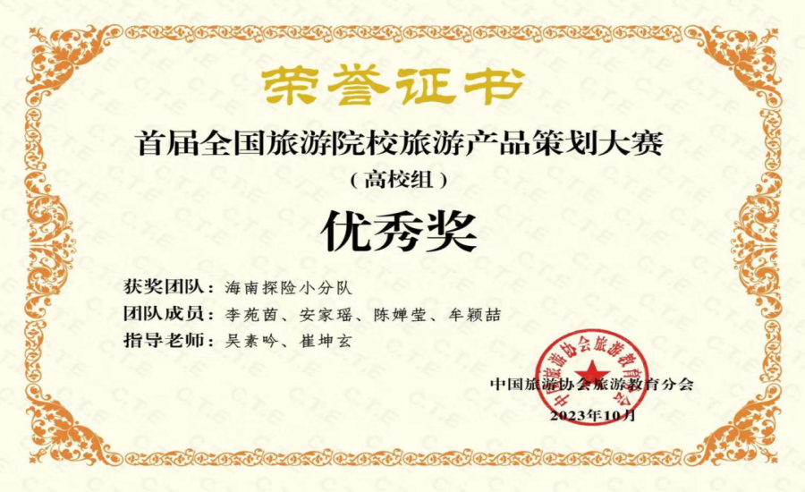 由中国旅游协会旅游教育分会主办的首届全国旅游院校旅游产品策划大赛自2023年8月初正式启动,得到了旅游院校师生的积极热烈响应,吸引了来自全国的316所旅游院校参加,组委会共审核通过903份报名作品。大赛打破传统的评奖机制,仅设优秀奖与参与奖两种奖项,其中前50%的作品获评优秀作品。我院积极鼓励学生参与比赛,来自旅游管理专业李苑茵、安家瑶、陈婵莹、牟颖喆团队的四位同学,在我院教师吴素吟和校外企业导师崔坤玄两位老师的共同指导下,取得了全国优秀奖的优异成绩,并位列优秀奖的前200位!吴素吟、崔坤玄两位老师荣获得优秀指导老师称号。
